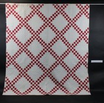 Double Irish Chain (variation). Cotton patchwork, alternate block set. Cotton batt, machine thread. Hand quilted diagonally in squares. Turkey red and white. Straight grain binding. Plain weave white backing. Wear pattern on opposite sides (head and foot) perhaps caused by a beard. Double Irish Chain (variation) - 1830-1920. Cotton patchwork, alternate block set. Cotton batting, machine thread. Hand quilted diagonally. Turkey red and ...
