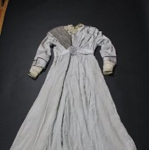 Gray silk dinner dress. Lace inset bib and high neck. Metallic lace shawl effect on left shoulder. Long sleeves with lace cuffs extending out. A lace insert from left waist rosette down left front to another rosette and flair. Lots of hooks and eyes. The tucks, folds, light boning, and self-fabric flowers at waist and knee are typical details on gowns of this era. Belonged to Ella McCabe James, who wore it as hostess at the Elkhorn Lodge....
