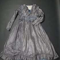 Charcoal gray taffeta long dress - long sleeves with snap closure and 4 self covered button trim. Peplum style cummerbund with blue stitching and a robin's egg blue velvet dickie. A double ruffle at bottom - one of gray and one of blue with rough cut edges.