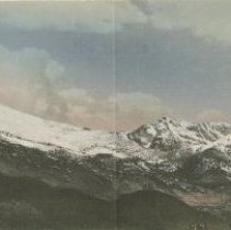 Double wide, hand-colored postcard featuring the Range, with Longs Peak and Mt. Meeker visible. Caption printed on reverse reads, "The Range, from Lester's / Scenes of Estes Park and the Rocky Mountain National Park, Colo. Playground of the World. Hand-colored." Publication information, "Published by W.T. Parke, Estes Park, Colo."