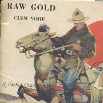 Raw Gold by Clem Yore. A Pocket Copyright. The frontispiece has a block print of a dog sled and team approaching a log cabin. Title pate has title, author and publisher. XVIII chapters, pgs 181. Back end papers have lists of other authors and titles, as does back cover. Colored drawing on front cover of a lawman on horseback following prints. A small drawing appears at the end of same chapter. Stab binding is stapled rather than sewn. Signed...
