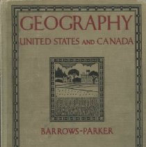 "Geography United States & Canada" gray cloth hardback with design containing school flag on cover in black. Lines design in black. 4 sides of cover. Geography United States and Canada, Barrows-Parker authors and Publisher Silver, Burdett and Company in red on cover. Back of book has black logo SB&Co in center. pgs 1-288. Spine of book had title and the authors in black lettering. A scrap of paper marks pg 42, a picture of the town of EP from L...