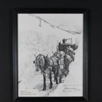 Black and white print of a four horse team with four men plowing through drifts on Fall River Road just below the pass on east side. Snow towers on each side and shows the top of one telephone pole. Has glass and wire hanger. Frame width is 1.5 cm Marks: Lower right corner in ink "Fall River Road/ Saturday/ June 14th 25" Lower left has typed sticker "In Honor of/ George W. Johnson/ Who Helped Shovel the Snow." On back stamped "Framed by/ Mat...