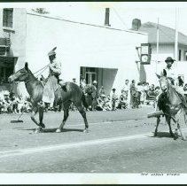The Rooftop Rodeo parade on Elkhorn Avenue, featuring two men, one on horse, one on mule, both with brooms. Spectators at curb. Buildings in the background on the north side of West Elkhorn Avenue in Block 3 include the Totem Shop and Estes Park Bank. The Hupp Hotel Annex is also in the background. Marks: On front in lower margin signed "223" and "The Larson Studio". On reverse in pencil "Maintenance Engineers" and in ink "L - Edgar Hyatt...