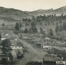 B/W photo print with narrow white border. Caption inside bottom border "Village of Estes Park, Colo. R-452 Sanborn " Shows Lewiston Hotel and Sherwood Hotel. Marks: A pencil mark from corner to corner lengthwise.