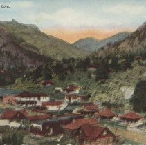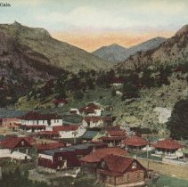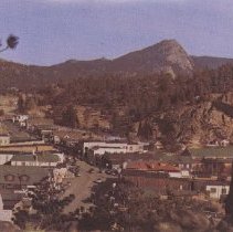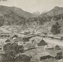 Color photo print with narrow white border. Caption in upper border "400 Village of Estes Park" IN lower border "Rocky Mountain National Park, Colorado. 108255" Description on reverse.