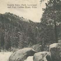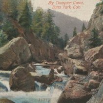 Black and white image of rapids along the Big Thompson River, somewhere in the canyon between Estes Park and Loveland, on the way to Fort Collins. The walls of the canyon and many trees are visible in the background. Written on the front reads "Rapids Estes Park, Loveland, and Fort Collins Road, Colo." The reverse has a green one cent stamp and is postmarked Estes Park, Colo., Jul 14, 1913. The card is addressed in pen to Miss Grace Van Win...