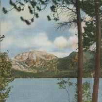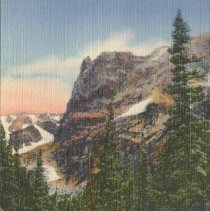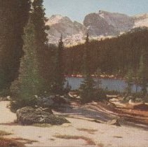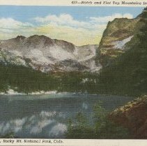 color linen no border. no caption on front but on reverse it reads, "Notch Top Peak and the outlet of Odessa Lake, Rocky Mountain National Park, Colorado. (North Top Mtn) Copy of 1985.035.044