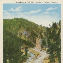 color linen type white border. Caption at top reads, "Rapids Hill, Big Thompson Canyon, Colorado"...at bottom, "Rocky Mountain National Park" Thompson Canyon road still graveled. Sanborn Souvenir Company: #409