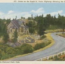color, linen type white border. Caption at top reads, "Scene on the South St. Vrain Highway Showing the Saint Malo Chapel." at bottom, "Rocky Mountain National Park, Colo. (Camp St. Malo Chapel) Sanborn Souvenir Company: #472