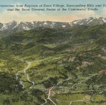 color photo print linen finish no border. Caption at top reads, "Panorama from Airplane of Estes Village, Surrounding Hills and Valleys and the snow covered Peaks of the Continental Divide." (Estes Park Valley) Sanborn Souvenir Company: #436