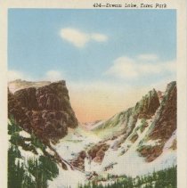 color, white border. Caption at top reads, "Dream Lake, Estes Park" bottom: "Rocky Mountain National Park, Colorado" Sanborn Souvenir Company: #424
