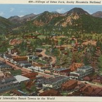 Color, linen-type, white border. Caption at top reads: "Village of Estes Park, Rocky Mountain National Park, Colo." At bottom: "One of the most interesting resort towns in the world." (Estes Park Town) Sanborn Souvenir Company: #400