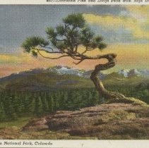 color linen type white border Caption at top reads "Lonesome Pine and Longs Peak from High Drive, Estes Park. At bottom, "Rocky Mountain National Park, Colorado" Sanborn Souvenir Company