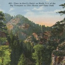 Color, linen-type, no border. Caption at top reads-- "View into Devils Gulch on North Fork of the Big Thompson to Glen Haven and Estes Park." Sanborn Souvenir Company: #408