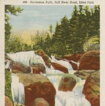 Color, linen-type, white border. Caption at top reads: Horseshoe Falls, Fall River Road, Estes Park." At bottom: "Rocky Mountain National Park, Colorado." The falls are a giant cascade extending for nearly a mile on the Roaring River. Sanborn Souvenir Company: #446
