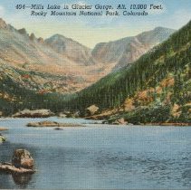 color, linen type, no border . Caption at top reads, "Mills Lake in Glacier Gorge, Alt. 10,000 feet/ Rocky Mountain National Park, Colorado" Sanborn Souvenir Company: #464