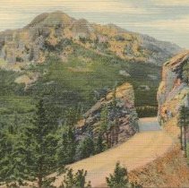 color linen type, no border. Caption on reverse reads, "The South St. Vrain Highway to Rocky Mountain National Park, the Crags and Twin Sisters Peak in the Background" C.T. Art-Colortone Sanborn Souvenir Company: #2267