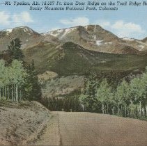 color linen type no border Caption at top reads, "Mt. Ypsilon, Alt. 13, 507 ft. from Deer Ridge on the Trail Ridge Road/Rocky Mountain National Park, Colorado" T R road graveled