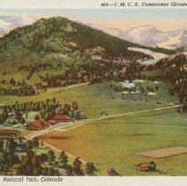 color linen type white border. caption at top reads, "Y.M.C.A. Conference grounds, Estes Park." At bottom "Rocky Mountain National Park, Colorado" Sanborn Souvenir Company: #402