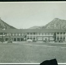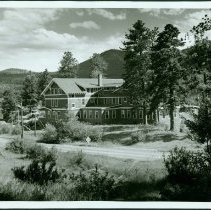 B/W glossy narrow white border. The main building of the Fall River Lodge Complex in Upper Horseshoe Park. Shows the lodge from the north showing new addition. Fall River Road on the north side. Marks: On reverse stamped "1950;" date is approximate.