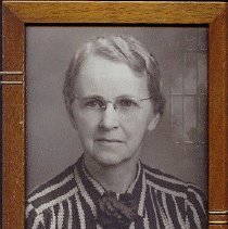 Framed portrait of Horseshoe Inn owner Esta Patrick. Brown, wooden grame with gold embellishments on vertical frame. Esta Patrick wears a striped blouse with a flower at the neck. She ears wire rimmed glasses and has a wave in her hair. In the background is a backdrop with a window.