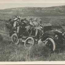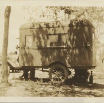 Sepia print of square shaped automobile. Handwritten in pencil on reverse reads, "Traveling house at Dayfayette Tourist Camp 1925" Stamped in blue ink on reverse reads, "The Gracraft Shop, Estes Park, Colo. We put the Snap in Snap Shots." Uncertain location.
