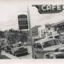 Black and white print of Elkhorn Avenue taken beneath the Blu-Bel Cafe lighted sign. Automobiles and people visible on the street. Businesses visible include Baird's Gift Shop, Havers Linen Shop, the Hupp Hotel, etc. A sign in foreground reads, "This establishment is recommended by Duncan Hines, Author Advenures in Good Eating, Appetizing Food, Along the Highways of America, Pleasant --- 1949 Traveling" Deer Mountain visible in background. ...