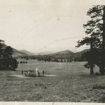 Black and white photograph featuring five people golfing on course at Estes Park with mountains in background. Handwritten in pencil on reverse reads, "Estes" Typed sheet of paper adhered to back reads, "ETX-55. With the inspiration of the commanding Rockies of Colorado ever at odds to overcome the most difficult hazard, golf on the Estes Park Country Club, at the entrance to Rocky Mountain National Park, truly is an innovation, a mile and...