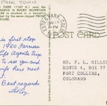 Color postcard of "Estes Park Town" Marks: postmarked - Estes Park, CO 1/23/60 |